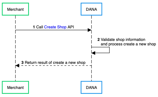 - Merchant initiates the process by calling the Create Shop API to DANA to create a new shop.