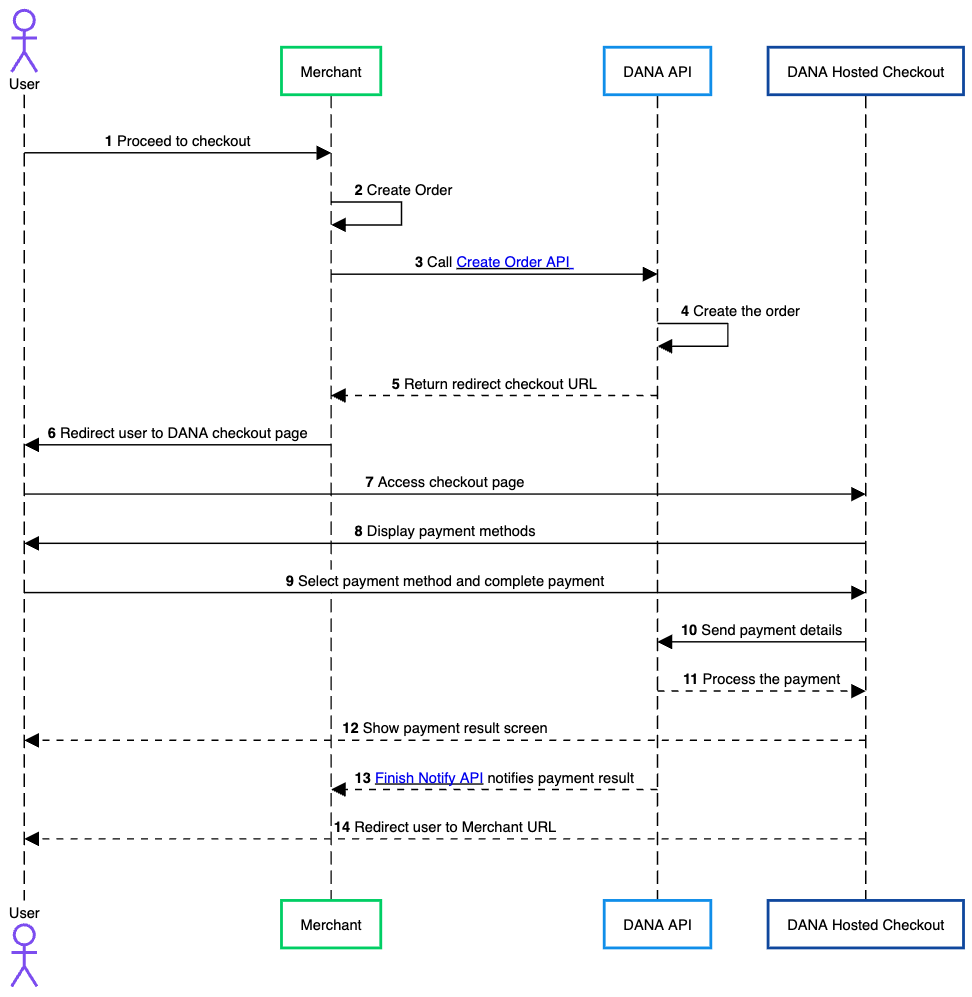 webRedirectUrlfor the checkout page. - The merchant uses the returned URL to prepare a redirection to DANA’s hosted checkout page.