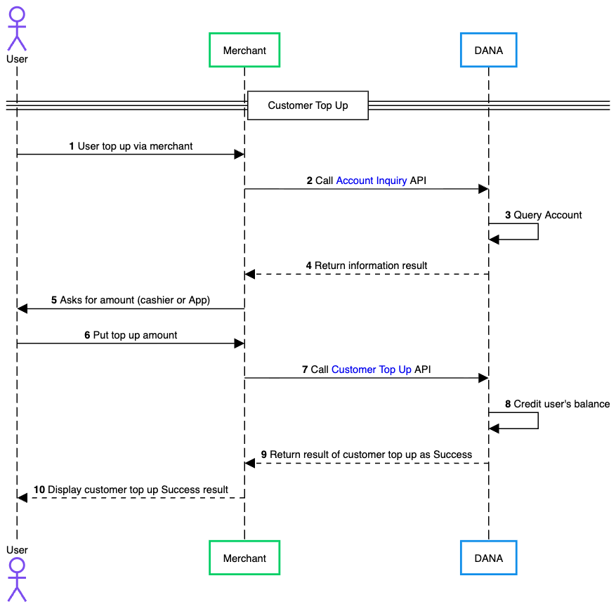 - After the user confirms the details, the merchant calls the Customer Top Up API to DANA to initiate the balance top-up.