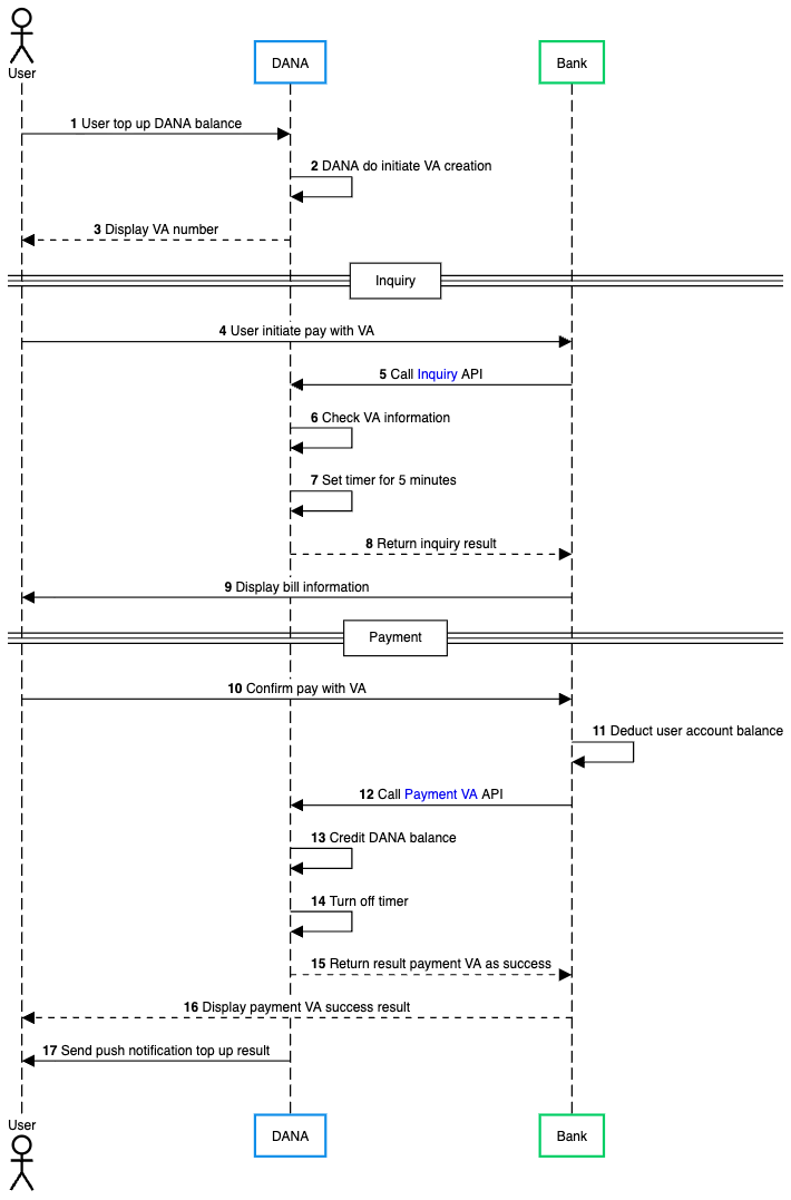- Bank calls Payment VA API request to DANA to complete the transaction.