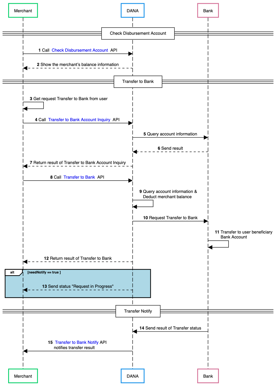 - Merchant calls DANA's Transfer to Bank API to initiate fund transfer to the validated bank account.
