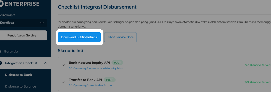 DANA will provide you with a list of scenarios that you need to test according to your selected solutions. To access the list, simply navigate to the Integration Checklist menu on our Merchant Portal. The menu will show all the payment solution you selected, and the list of scenarios you need to complete for each